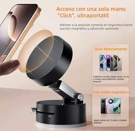 Este no es un soporte común. Gracias a su tecnología de imantación instantánea, solo tienes que acercar tu teléfono y —¡click!— quedará sujeto con total seguridad. Su brazo articulado te permite ajustar el ángulo perfecto en segundos, permitiéndote alternar entre el modo vertical y horizontal sin esfuerzo.